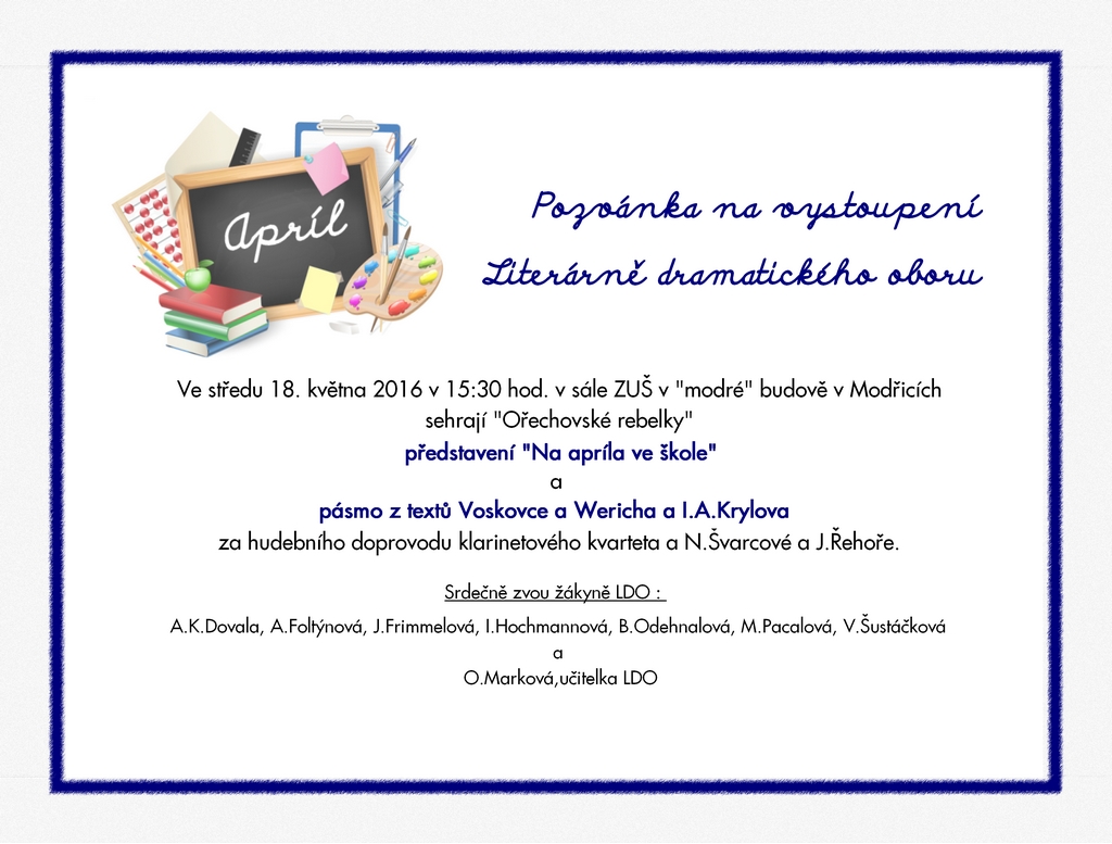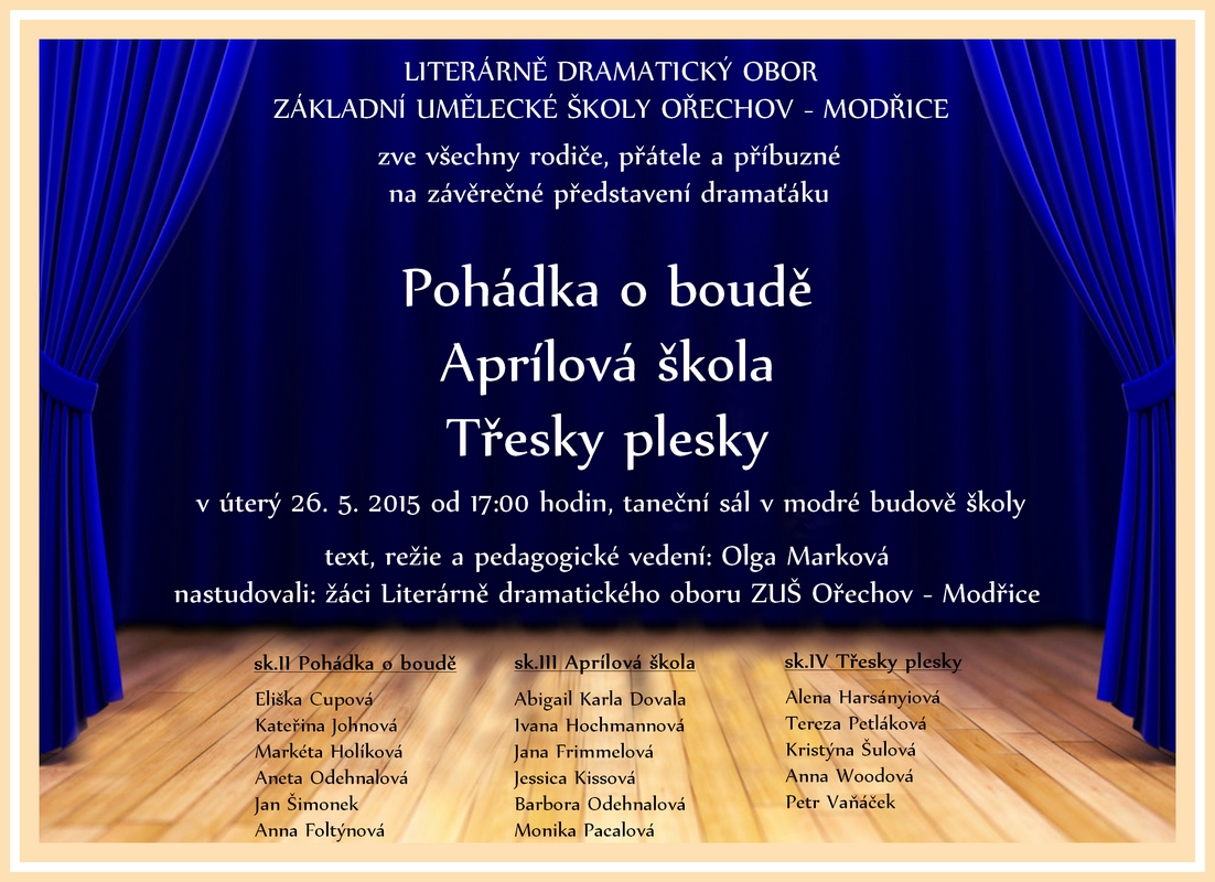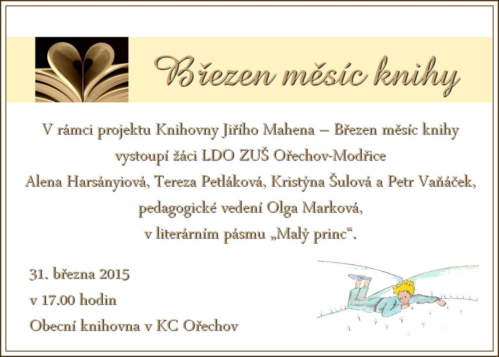 • Vystoupení Literárně-dramatického oboru, 8.4.2013, 17.00 hodin v prostorách Obecní knihovny v KC Ořechov;