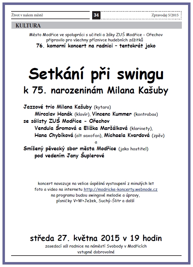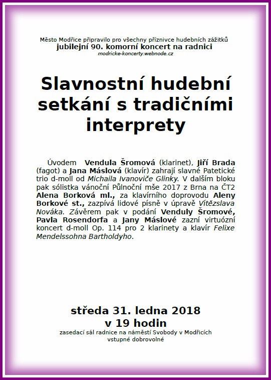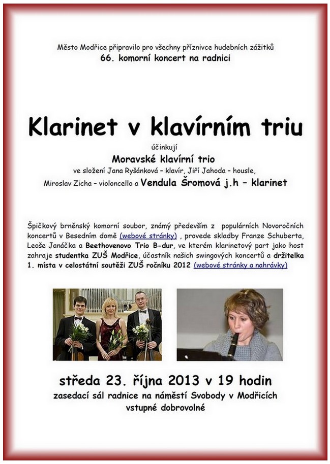 • Koncert Venduly Šromové "Klarinet v klavírním triu", 23.10.2013, 19.00 hodin v zasedacím sále na radnici Modřice; (více ZDE)