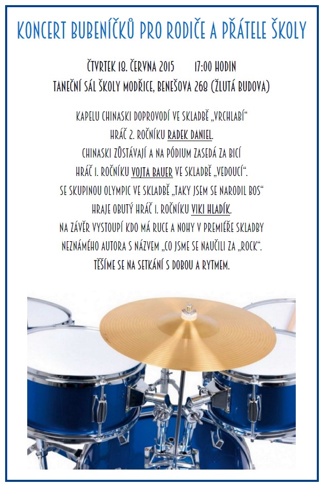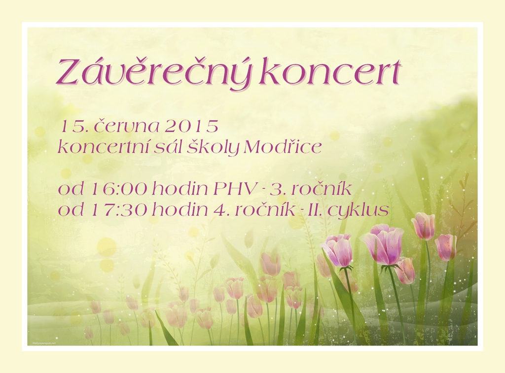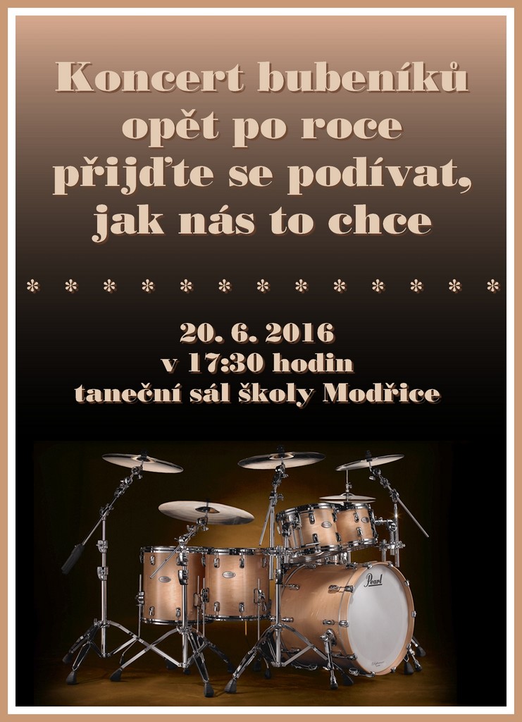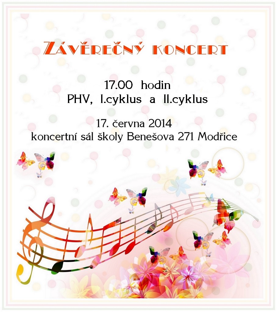 • Závěrečný koncert žáků Hudebního oboru, koncertní sál školy Modřice, 12.6.2013, 16.00 hodin - 1.-4. ročník, 17.30 hodin - 5. a vyšší  ročníky;