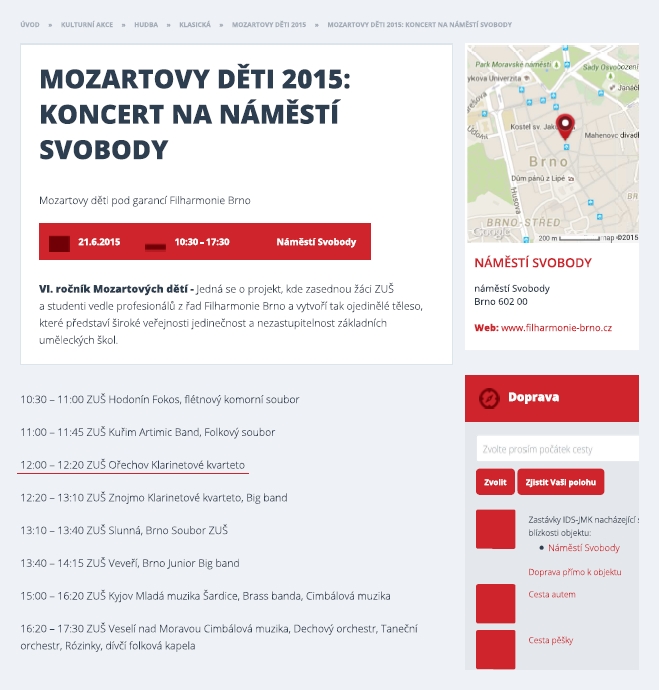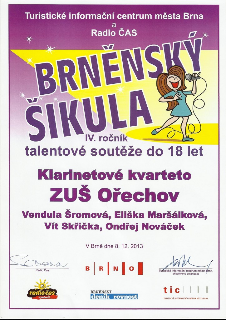 • Finálový galavečer IV. ročníku Brněnský šikula, nám. Svobody Brno - klarinetové kvarteto (vybráno na základě 1.místa v soutěži Brněnský vrabčák), 8.12.2013, 13.20 hodin; (diplom ZDE,  foto ZDE,  článek na stránkách Turistického informačního centra města Brna, příspěvková organizace ZDE)
