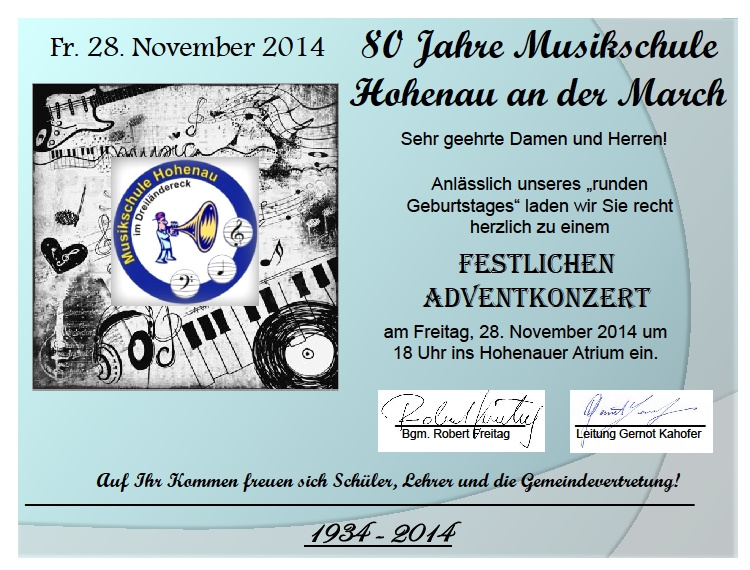 • Společný koncert s Musikschule Hohenau an der March - "Hudba nezná hranic", konaný v rámci Dne hudebních škol Dolního Rakouska, 9.5.2014, Atrium - městský sál Hohenau (fotografie ZDE)