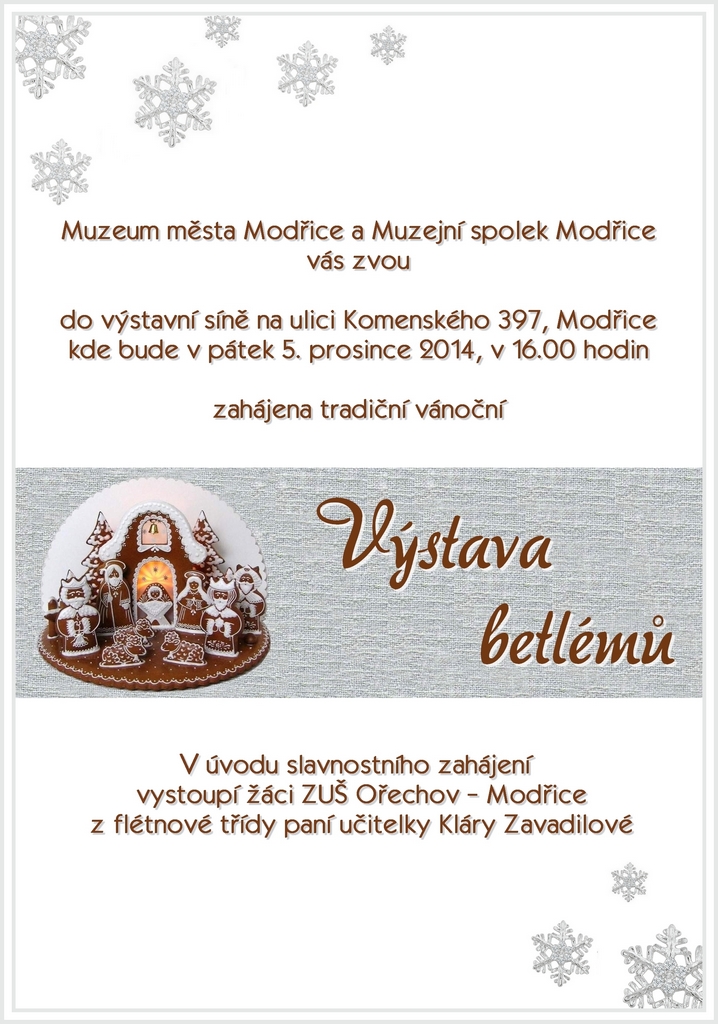 • Muzeum města Modřice "Výstava betlémů" - vystoupení žáků a pedagogů ZUŠ při zahájení výstavy, 6.12.2013, 16.00 hodin v Muzeu města Modřice;
