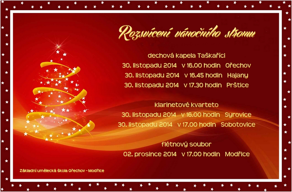 • Vánoční jarmark Ořechov - vystoupení žáků Hudebního oboru, 1.12.2013, 16.00 hodin ve vestibulu KC Ořechov; (více ZDE)