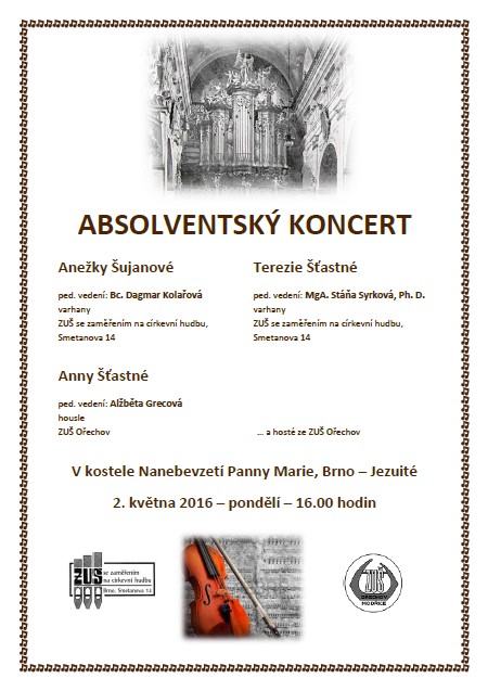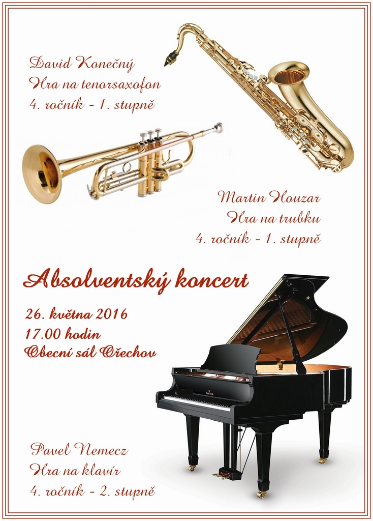 • Absolventský koncert - Pavla Sychrová (klavír), Kateřina Zezulová (klavír), Marek Brada (trubka) - 7.ročník I.cyklu, 16.4.2013, 17.00 v koncertním sále školy Modřice;