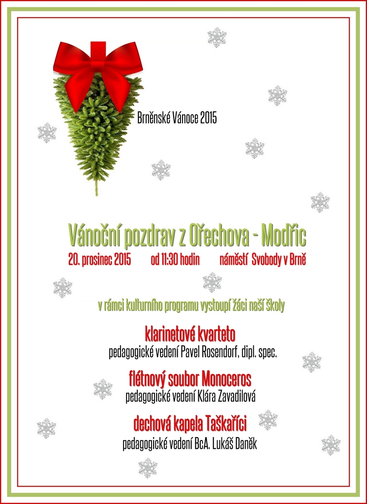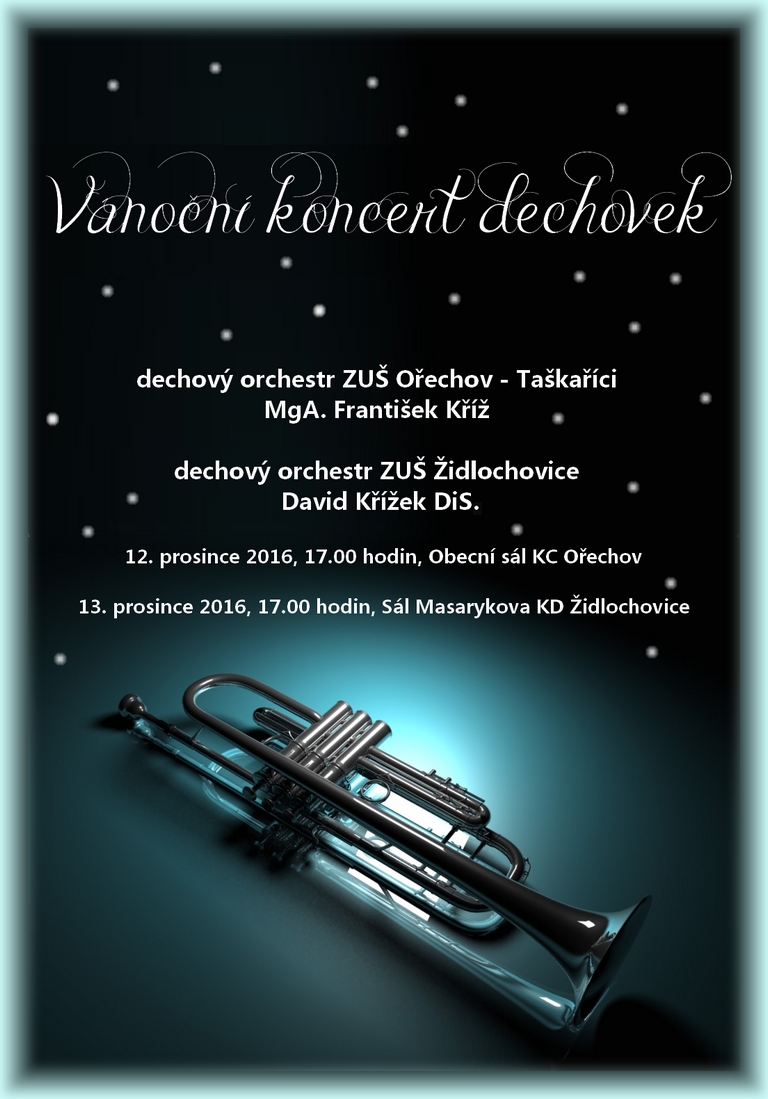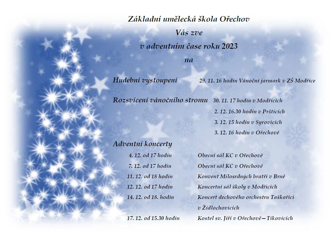 • Vánoční koncerty Ořechov, Obecní sál KC Ořechov, 10.12.2011, 16.00-17.30 hodin - PHV-3.ročníky a kroužky, 10.12.2011, 18.00-19.30 hodin - soubory a žáci vyšších ročníků;
