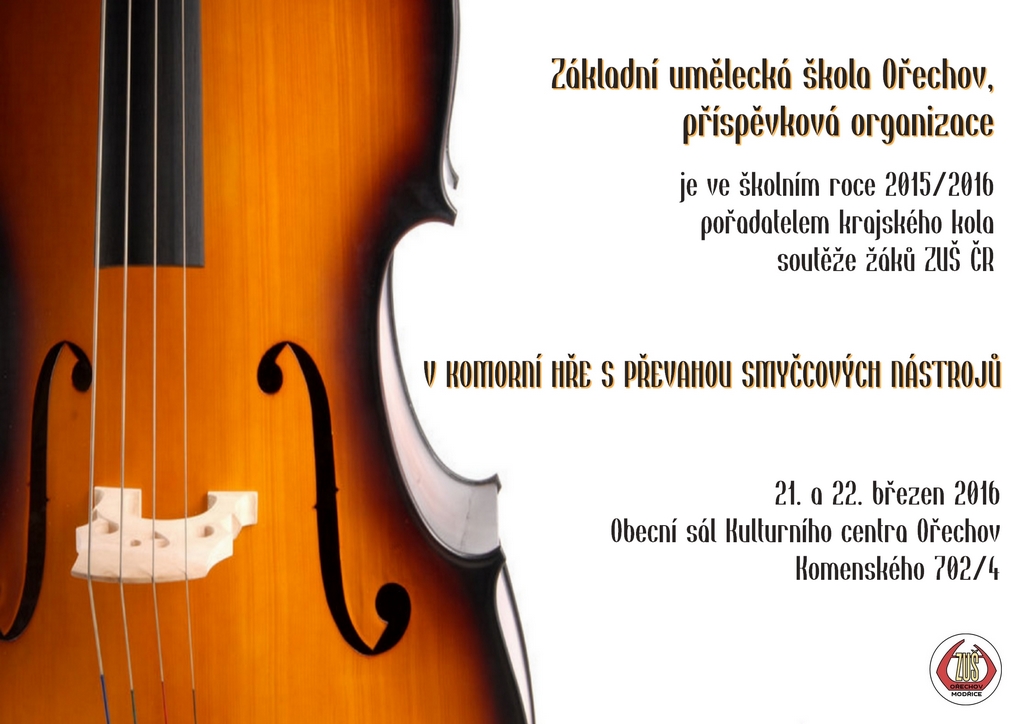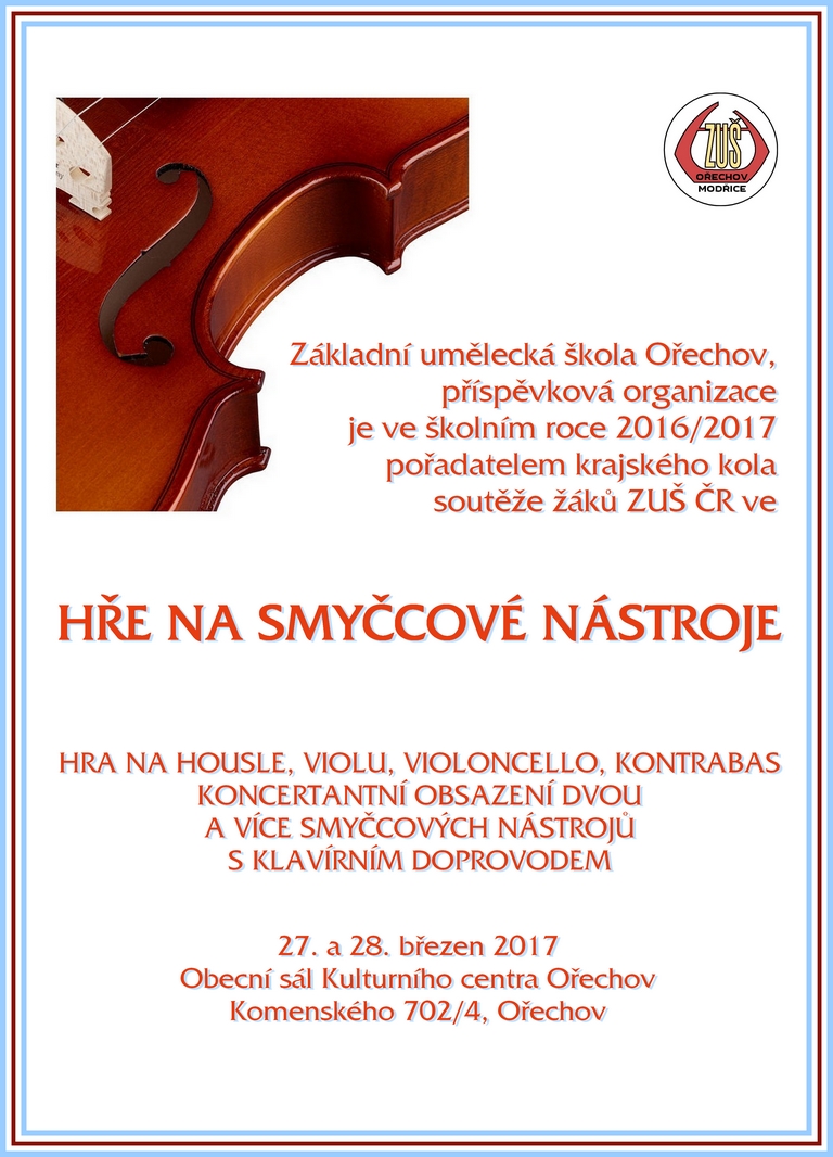 • Okresní kolo Soutěže žáků ZUŠ ve školním roce 2013/2014 - Hra na smyčcové nástroje, 7.3.2014, 8.00 hodin v koncertním sále školy Modřice, ZUŠ Ořechov byla pořádající školou; (plakátek ZDE, harmonogram ZDE, výsledky ZDE, foto ZDE)