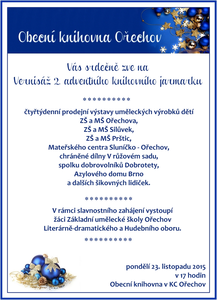 • Adventní podvečer v Obecní knihovně KC Ořechov, K. J. Erben - Štědrý den, žáci Literárně-dramatického oboru ZUŠ Ořechov, 11.12.2013;