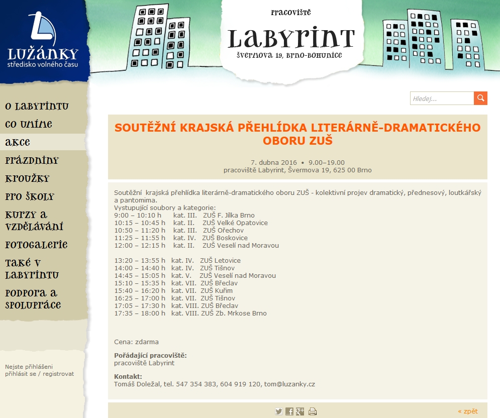 • Krajské kolo Soutěže žáků ZUŠ - soutěžní přehlídka Literárně-dramatického oboru, 2.4.2014, Brno;
