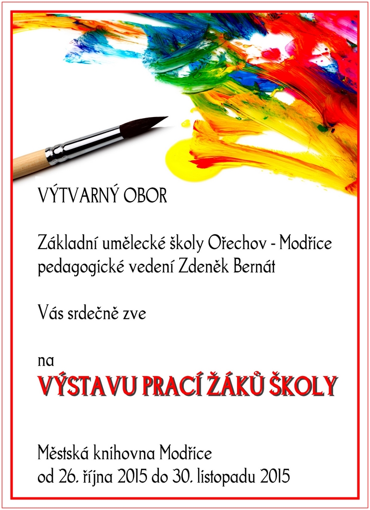 • Slavnostní zahájení výstavy obrazů učitele Výtvarného oboru Zdeňka Bernáta, 2.5.2014, 16.00 hodin v Muzeu města Modřice; (pozvánka ZDE) Výstava otevřena 3.5.-3.6.2014