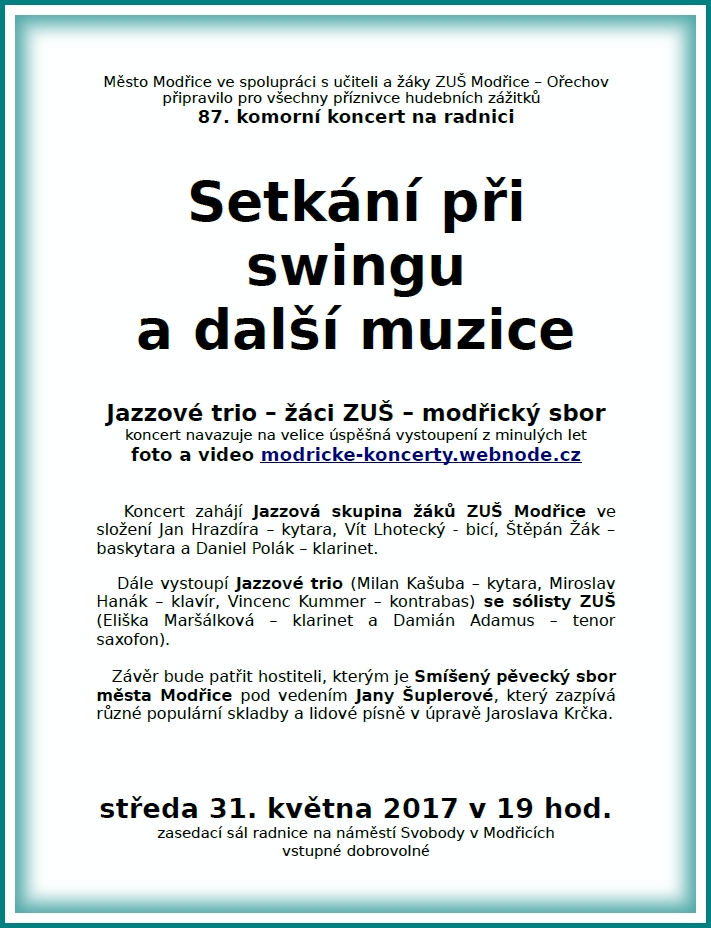 • Klavírní koncert - sólista Jan Šimandl, 22.4.2014, 17.30 hodin v koncertním sále školy Modřice; (pozvánka ZDE, více ZDE)