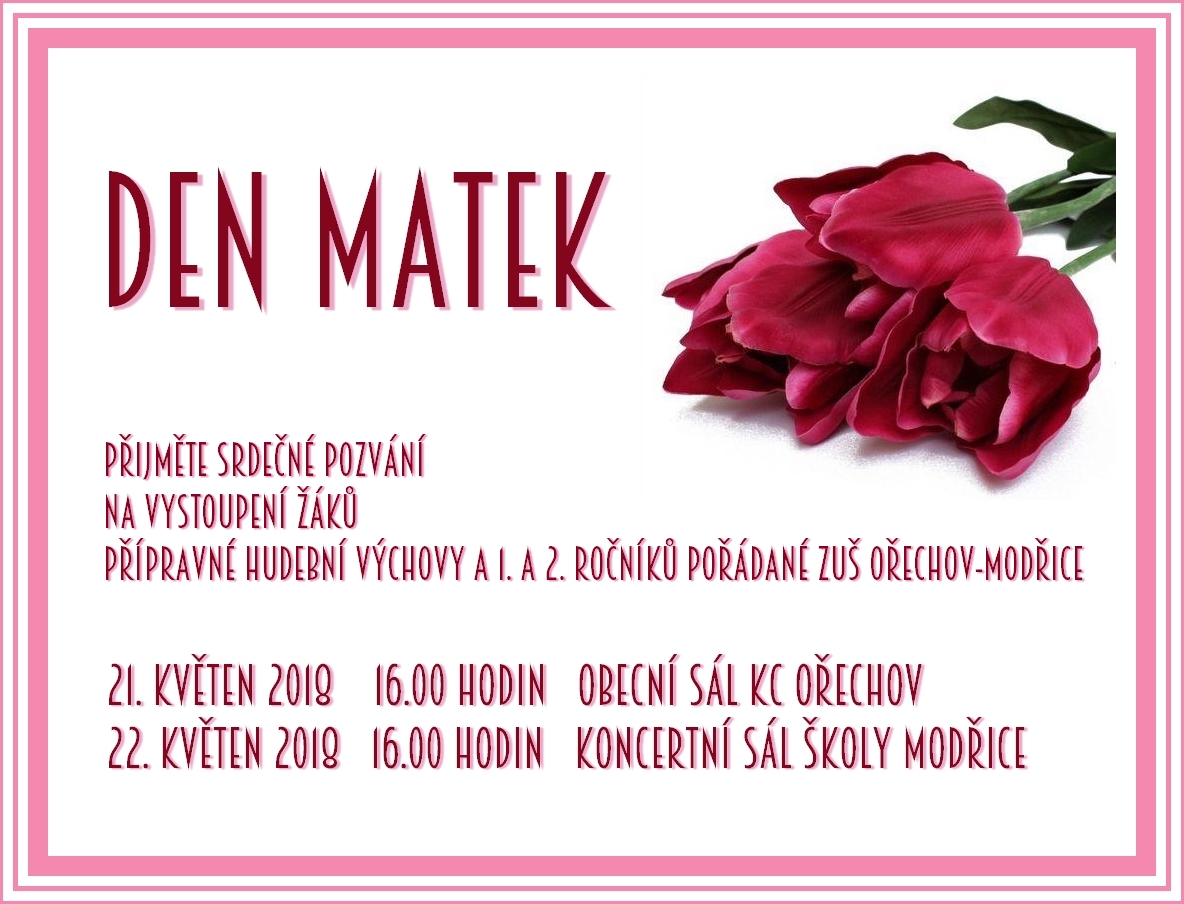 • Žákovské vystoupení ke Dni matek, 13.5.2013, 16.00 hodin v Obecním sále KV Ořechov;