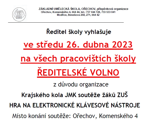 • Společný koncert "Ve víru klavíru" - společný koncert ZUŠ Ořechov, pobočka Modřice a Syrovice a ZUŠ Židlochovice, 27.3.2013, 17.00 hodin v koncertním sále školy Modřice, vystoupí žáci pedagogů klavírních oddělení obou škol;