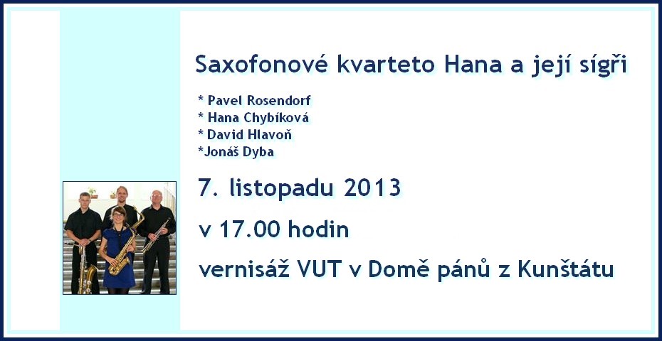• Saxofonové kvarteto Hana a její sígři - vernisáž VUT Brno, 7.11.2013, 17.00 hodin v Domě pánů z Kunštátu; (více ZDE)