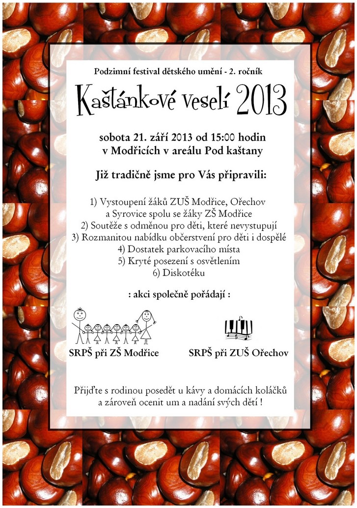 • Festival Kaštánkové veselí  2013, 21.9.2013, 15.00 hodin v areálu Pod kaštany Modřice;(více ZDE)