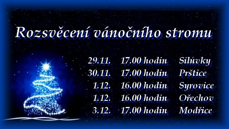 • Rozsvícení vánočních stromů, Modřice - 29.11.2011, 17.00 hodin, Syrovice - 2.12.2011, 15.30 hodin,  Ořechov - 2.12.2011, 16.30 hodin, Silůvky - 2.12.2011, 19.00 hodin;