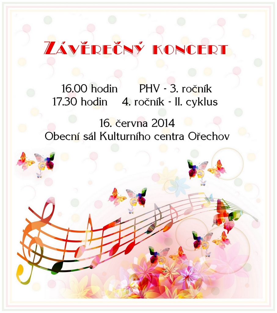 • Závěrečný koncert žáků Hudebního oboru, Obecní sál KC Ořechov, 13.6.2013, 16.00 hodin - 1.-4. ročník, 17.30 hodin - 5. a vyšší  ročníky;